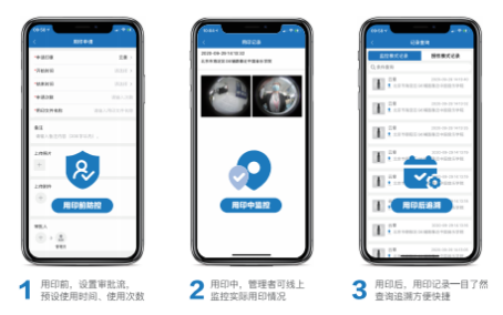 智能印章可通過手機(jī)APP操作,設(shè)置分級審核,從而實(shí)現(xiàn)人章分離、自動(dòng)電子鎖、遠(yuǎn)程申請、遠(yuǎn)程審批、印章全程監(jiān)控、全程記錄、蓋章記錄可溯可查,徹底解決群眾“用章難”的問題。