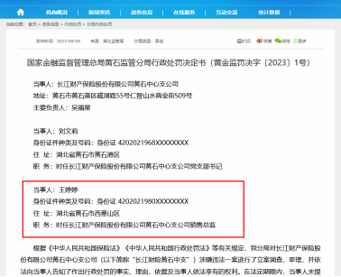 9月4日,國家金融監督管理總局官網發布信息,長江財產保險股份有限公司黃石中心支公司原銷售總監王婷婷私刻公章、騙取客戶資金,被終身禁止進入保險業。