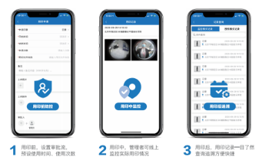 智能印章采用云平臺、客戶端(手機App和Web)及智能終端三位融合的交互方式,通過鏡頭記錄每一次蓋章的過程:使用人、對象、時間、地點,確保用印過程可防控、可監管、可查詢、可追溯,防范用印風險,真正解放印章管理者工作壓力,降低風險。