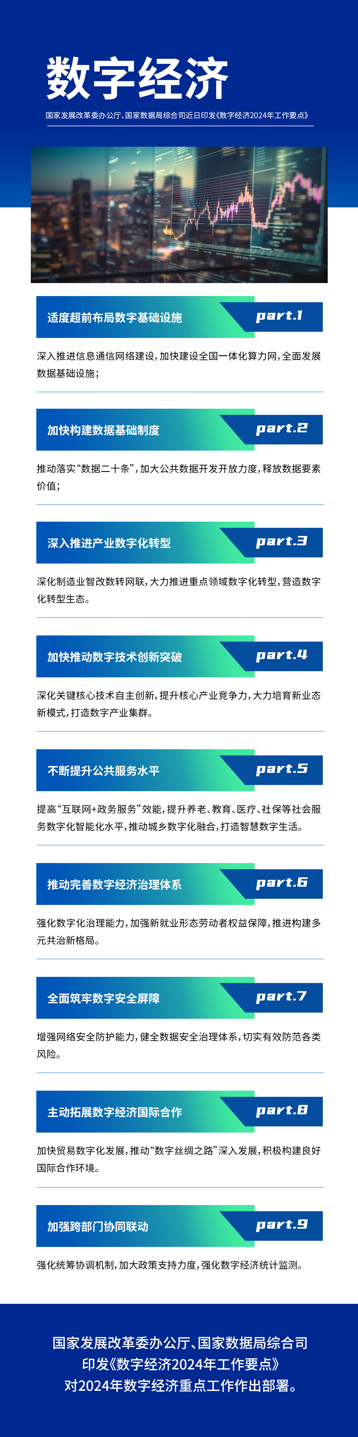 近日,國家發展改革委辦公廳、國家數據局綜合司印發《數字經濟2024年工作要點》(以下簡稱《工作要點》),對2024年數字經濟重點工作作出部署。