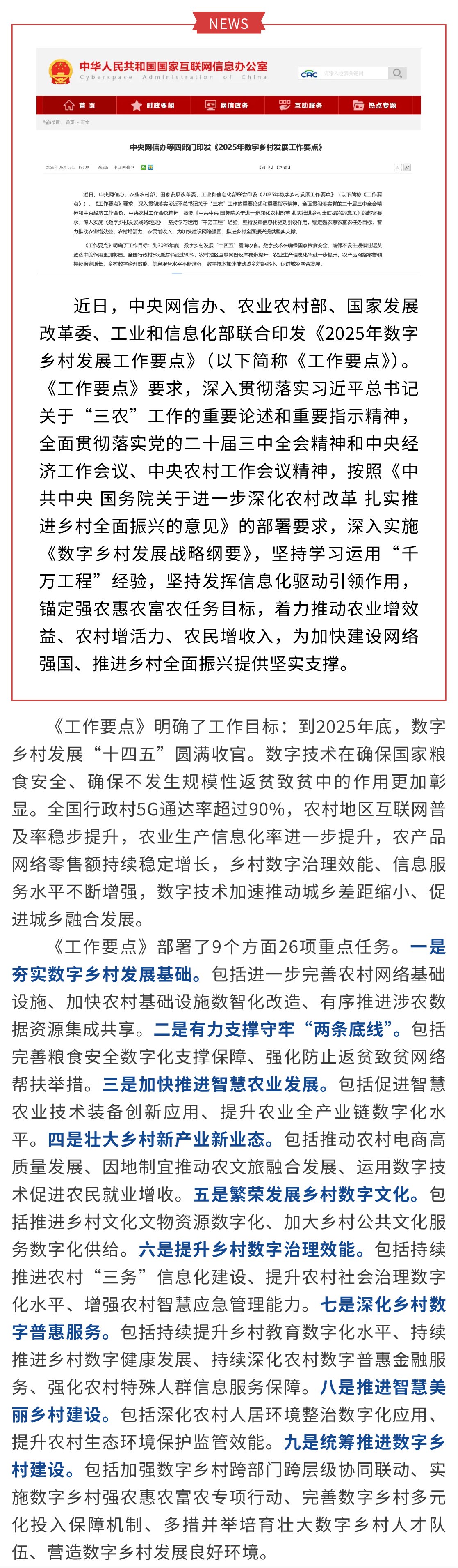 中央網信辦等四部門印發《2025年數字鄉村發展工作要點》